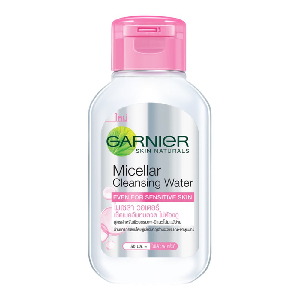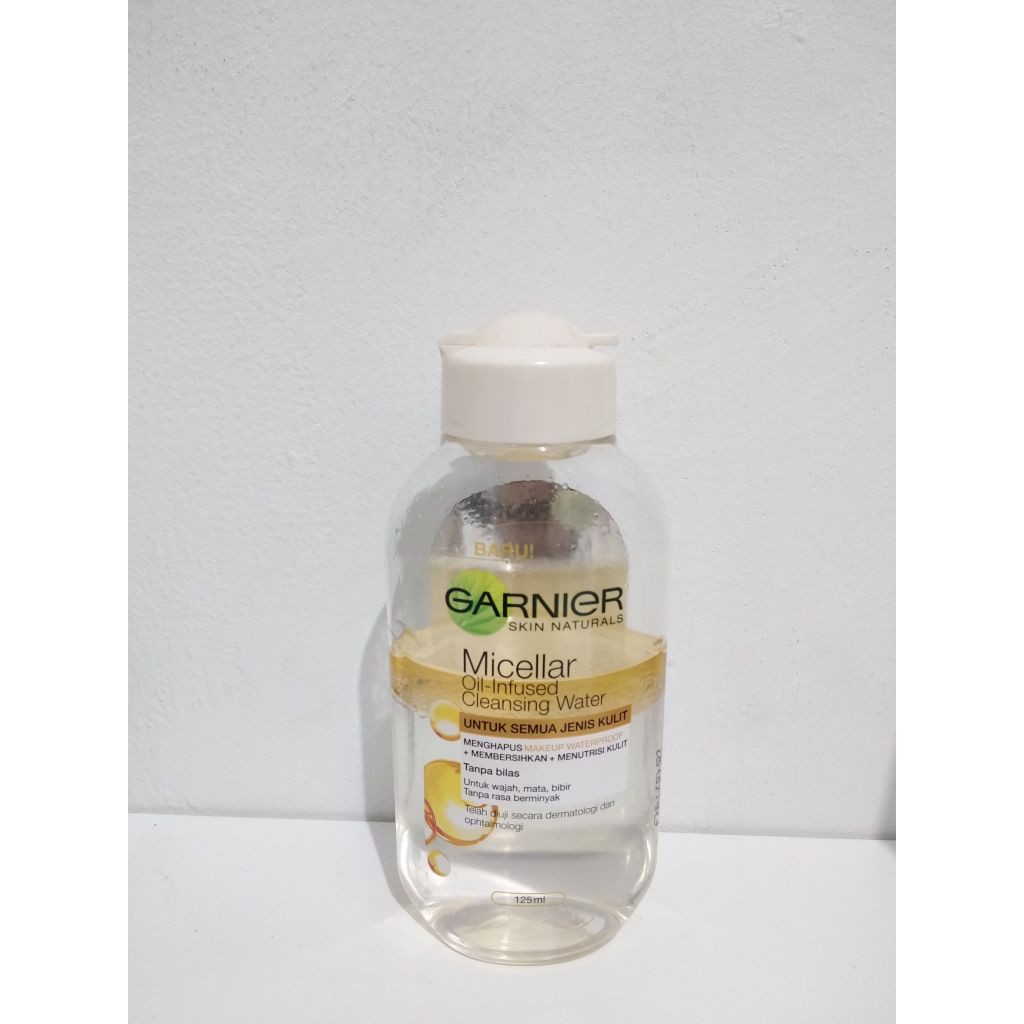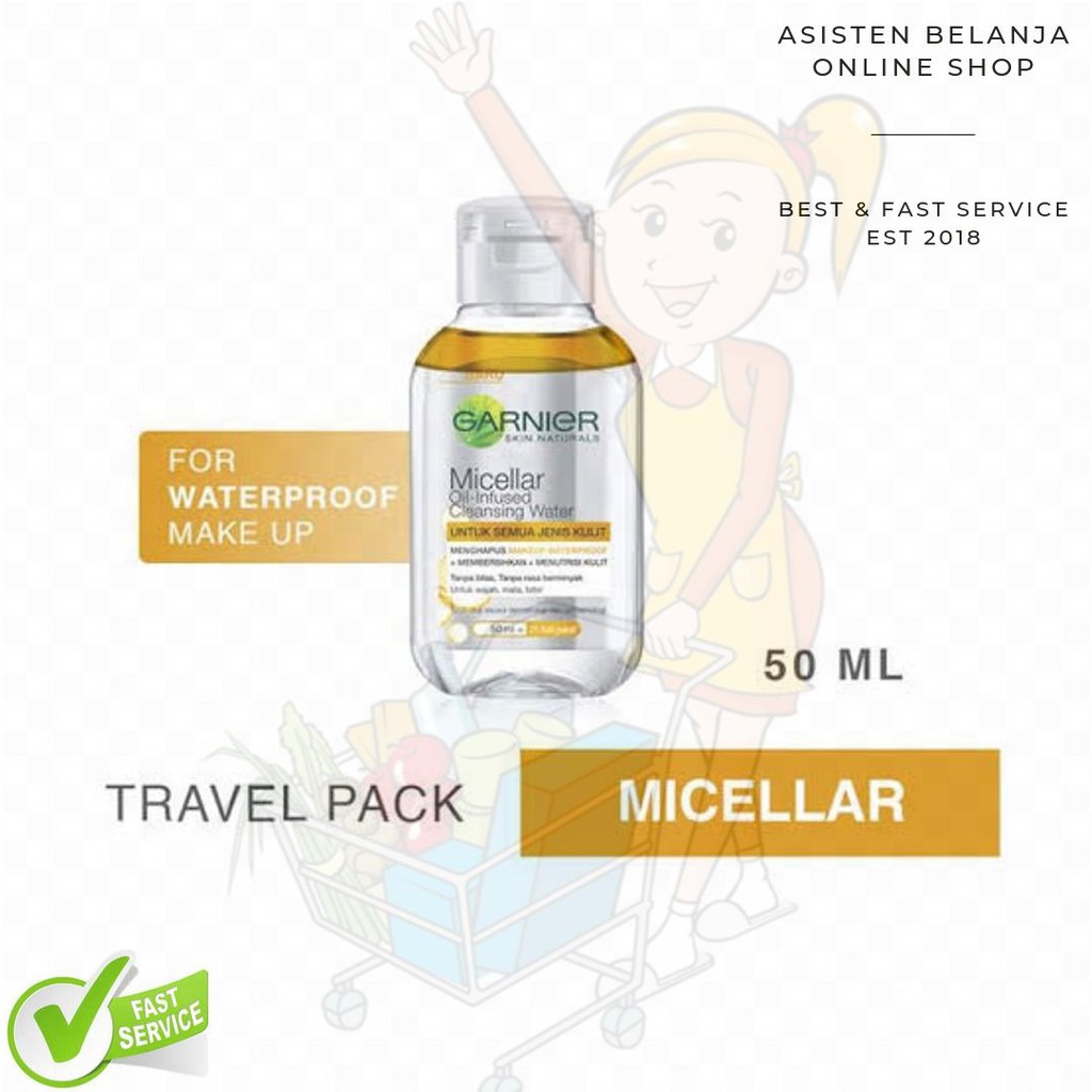 Garnier micellar oil infused cleansing water 50ml. Micelles are an active cleansing ingredient which act as a magnet to capture impurities make up and sebum on the skin without vigorous rubbing. This micellar oil infused cleansing water is an easy way to remove even waterproof make up and cleanse and nourish the feel of skin in one step without rinsing. Garnier micellar cleansing water uses micelles to leave the skin perfectly cleansed and refreshed without rigorous rubbing a rinsing. Garnier oil infused micellar cleansing water ampuh mengangkat make up water proof.